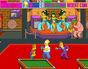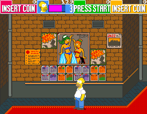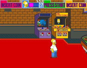 ![]() | Moe's arcade features cabinets for "Aliens" and "The Simpsons." Ridley Scott's "Aliens" was another franchise owned by Konami — the company that made this game — at the time. This is actually the second time the Simpsons arcade game contains an in-game reference to itself, the first was a poster in the window of the Noiseland Arcade in Stage 1. |